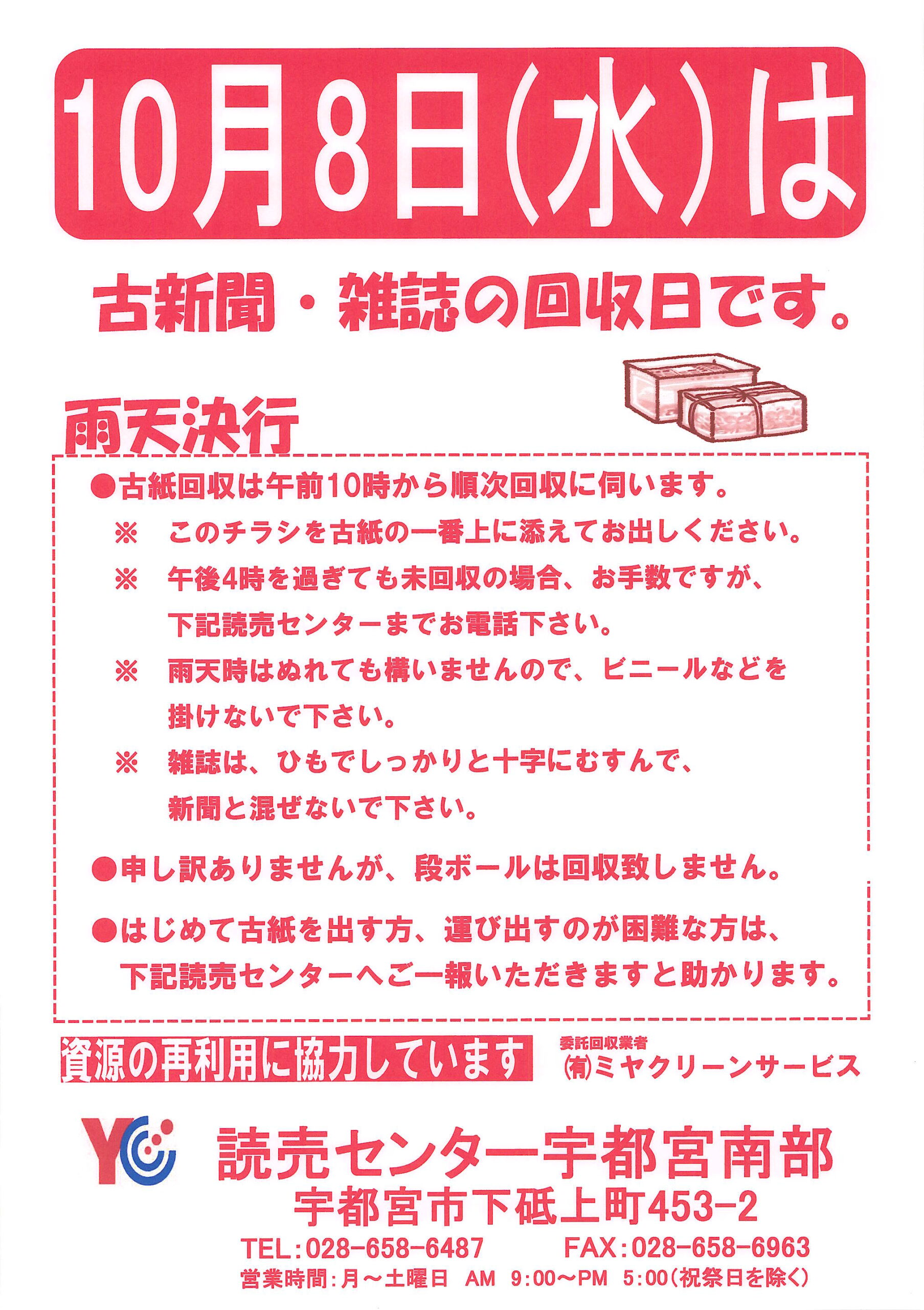 古紙回収日 2023.05.282025.10.02 今月の古紙回収日は、こちらです。 エリアを専用車で周りながら、新聞を回収する為、出来るだけ目立つところに置いていただけるようご協力をお願い致します。 EPSON MFP image お問い合わせはこちら
