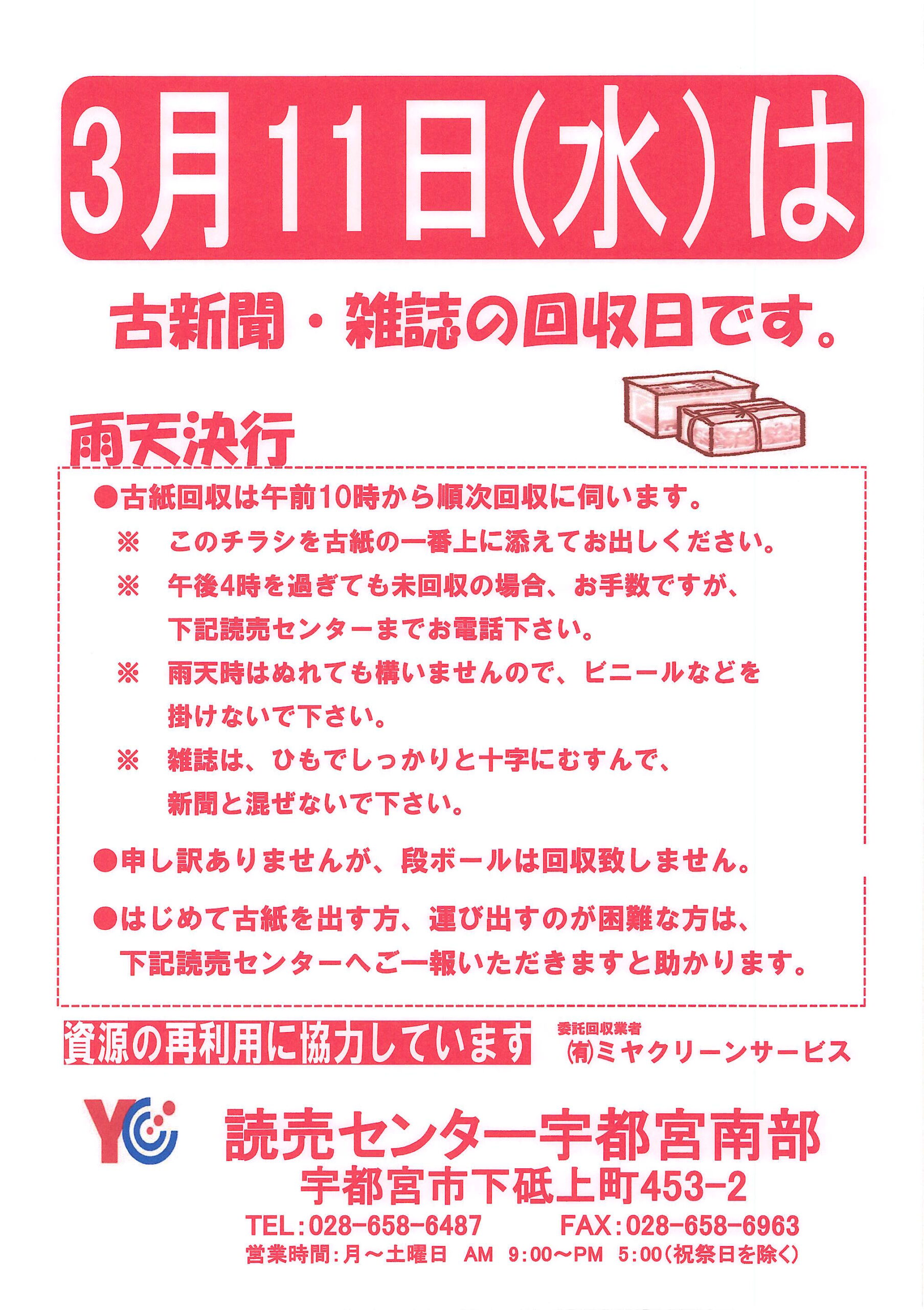 古紙回収日 2023.05.282026.03.09 今月の古紙回収日は、こちらです。 エリアを専用車で周りながら、新聞を回収する為、出来るだけ目立つところに置いていただけるようご協力をお願い致します。 EPSON MFP image お問い合わせはこちら